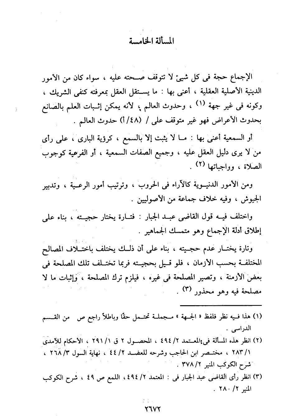 الإجماع حجة في كل شيء لا تتوقف صحته عليه، سواء كان من الأمور الدينية الأصلية العقلية، أعني بها: ما يستقل العقل بمعرفته كنفي الشريك، وكونه في غير جهة، وحدوث العالم؛ لأنه يمكن إثبات العلم بالصانع بحدوث الأعراض فهو غير متوقف على/ (48/ أ) حدوث العالم.