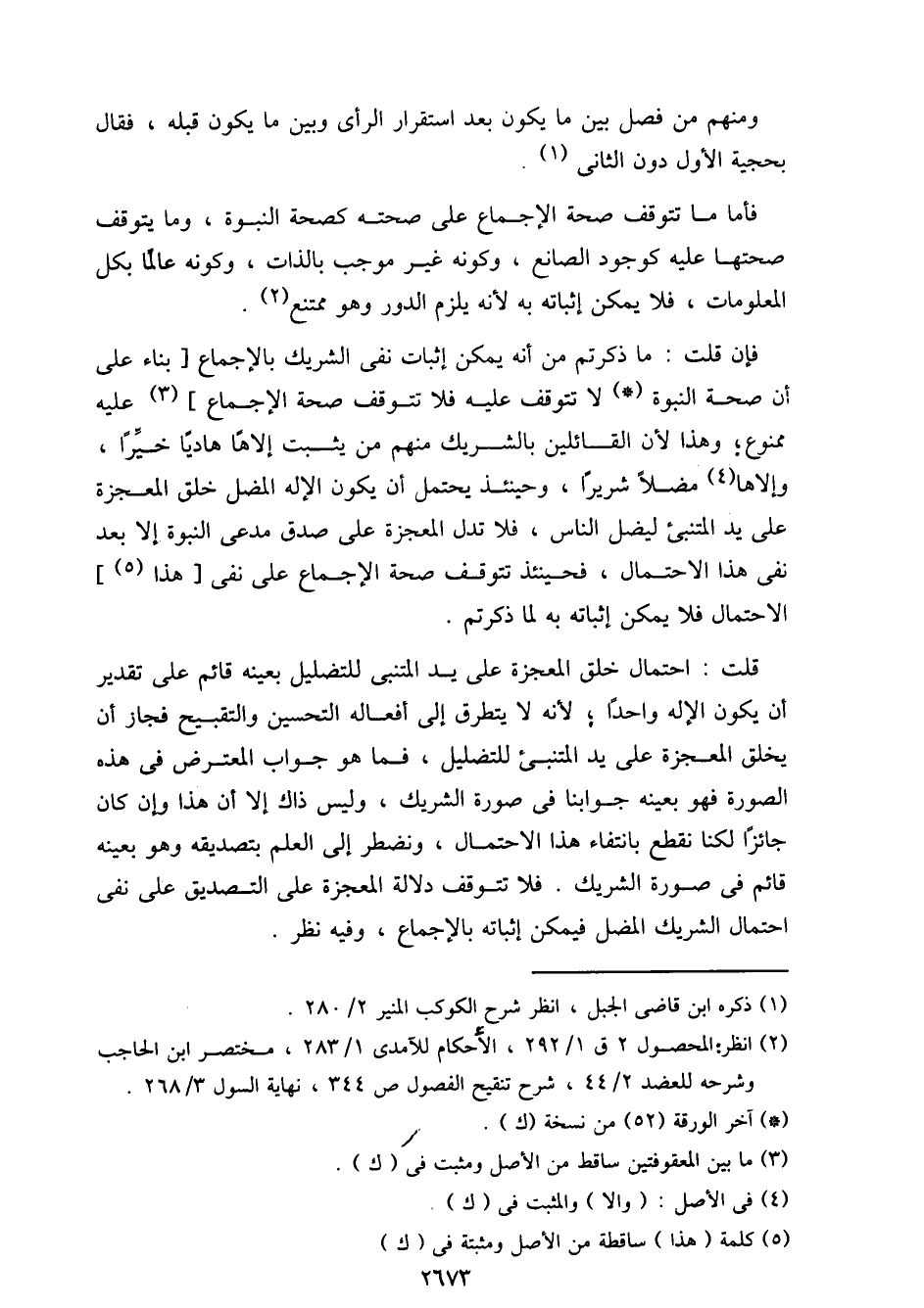 قلت: احتمال خلق المعجزة على يد المتنبي للتضليل بعينه قائم على تقدير أن يكون الإله واحدًا؛ لأنه لا يتطرق إلى أفعاله التحسين والتقبيح فجاز أن يخلق المعجزة على يد المتنبئ للتضليل، فما هو جواب المعترض في هذه الصورة فهو بعينه جوابنا في صورة الشريك، وليس ذاك إلا أن هذا وإن كان جائزًا لكنا نقطع بانتفاء هذا الاحتمال، ونضطر إلى العلم بتصديقه وهو بعينه قائم في صورة الشريك. فلا تتوقف دلالة المعجزة على التصديق على نفي احتمال الشريك المضل فيمكن إثباته بالإجماع، وفيه نظر.