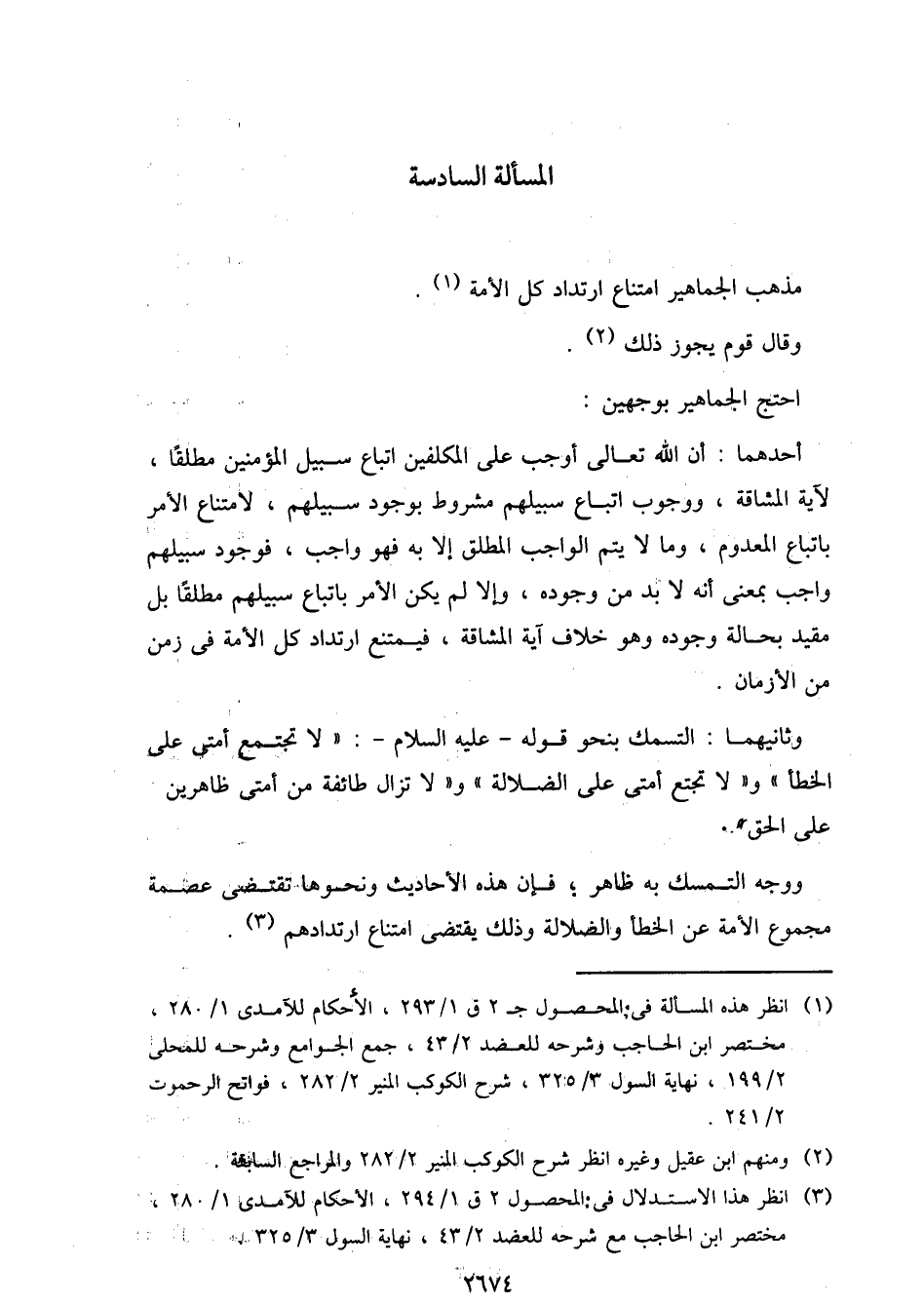 أحدهما: أن الله تعالى أوجب على المكلفين اتباع سبيل المؤمنين مطلقًا، لآية المشاقة، ووجوب اتباع سبيلهم مشروط بوجود سبيلهم، لامتناع الأمر باتباع المعدوم، وما لا يتم الواجب المطلق إلا به فهو واجب، فوجود سبيلهم واجب بمعنى أنه لا بد من وجوده، وإلا لم يكن الأمر باتباع سبيلهم مطلقًا بل مقيد بحالة وجوده وهو خلاف آية المشاقة، فيمتنع ارتداد كل الأمة في زمن من الأزمان.