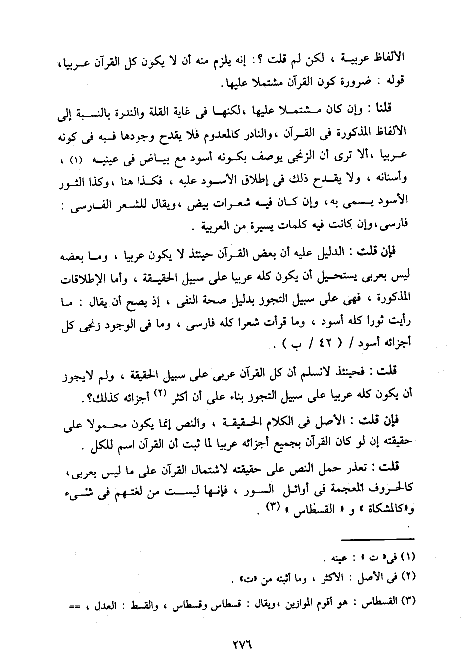 قلت: تعذر حمل النص على حقيقته لاشتمال القرآن على ما ليس بعربي، كالحروف المعجمة في أوائل السور، فإنها ليست من لغتهم في شيء و "كالمشكاة" و "القسطاس".