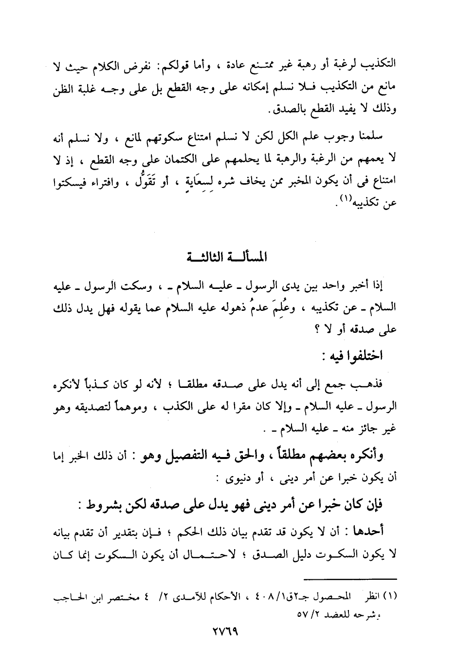 سلمنا وجوب علم الكل لكن لا نسلم امتناع سكوتهم لمانع، ولا نسلم أنه لا يعمهم من الرغبة والرهبة لما يحلمهم على الكتمان على وجه القطع، إذ لا امتناع في أن يكون المخبر ممن يخاف شره لسعاية، أو تقول، وافتراء فيسكتوا عن تذيبه.