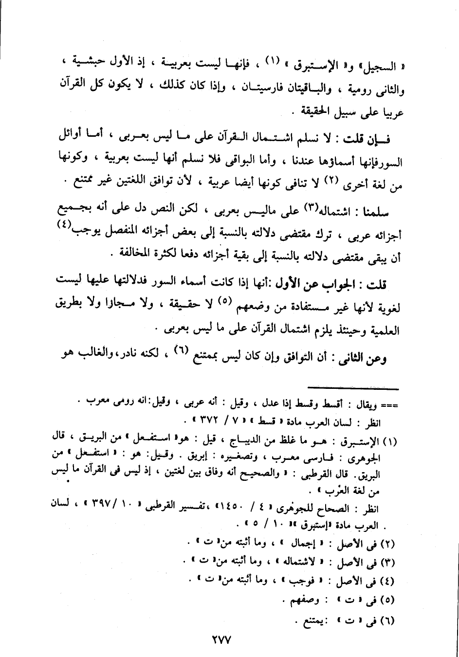 "السجيل" و "الإستبرق"، فإنها ليست بعربية، إذ الأول حبشية، والثاني رومية، والباقيتان فارسيتان، وإذا كان كذلك، لا يكون كل القرآن عربيا على سبيل الحقيقة.