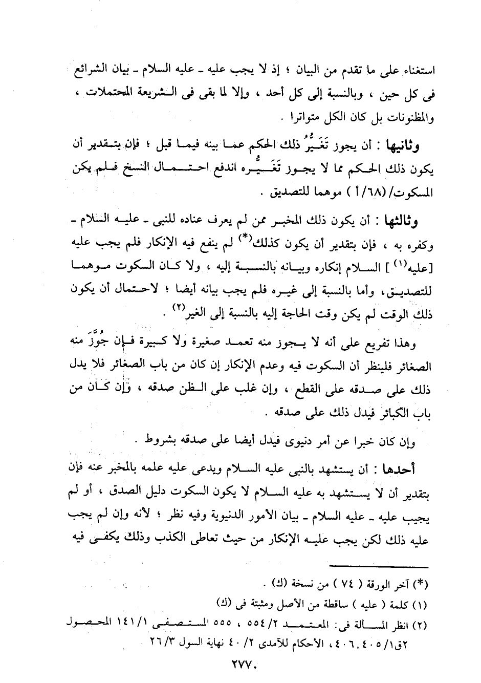 وثانيها: أن يجوز تغير ذلك الحكم عما بينه فيما قبل؛ فإن بتقدير أن يكون ذلك الحكم مما لا يجوز تغيره اندفع احتمال النسخ فلم يكن المسكوت / (68/أ) موهما للتصديق.