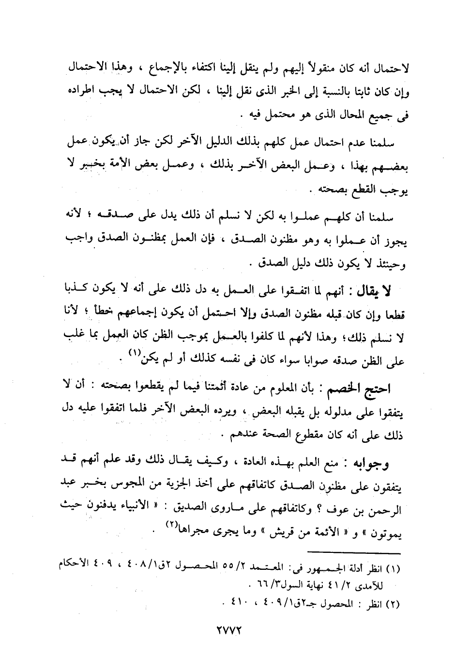 وجوابه: منع العلم بهذه العادة، وكيف يقال ذلك وقد علم أنهم قد يتفقون على مظنون الصدق كاتفاقهم على أخذ الجزية من المجوس بخبر عبد الرحمن بن عوف؟ وكاتفاقهم على ما روى الصديق: "الأنبياء يدفهون حيث يموتون" و"الأئمة من قريش" وما يجري مجراها.
