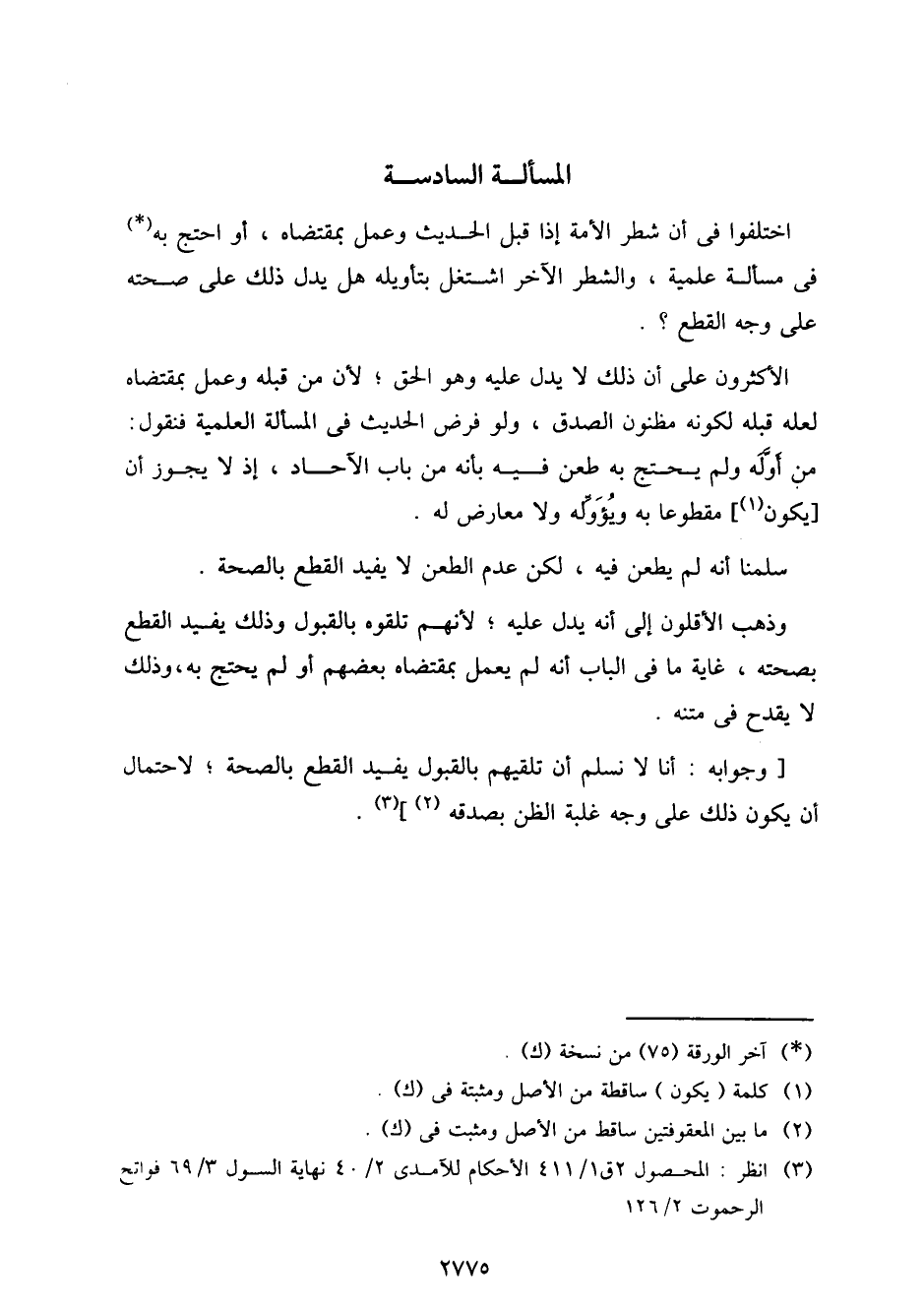 اختلفوا في أن شطر الأمة إذا قبل الحديث وعمل بمقتضاه، أو احتج به في مسألة علمية، والشطر الآخر اشتغل بتأويله هل يدل ذلك على صحته على وجه القطع؟