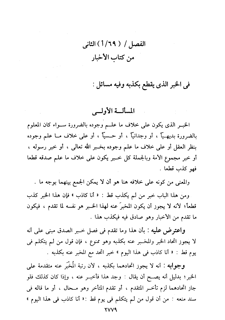 واعترض عليه: بأن هذا وما تقدم في فصل خبر الصدق مبني على أنه لا يجوز اتحاد الخبر والمخبر عنه بكذبه وهو ممنوع، فإن قول من لم يتكلم في يوم قط: "أنا كاذب في هذا اليوم" خبر اتحد مع المخبر عنه بكذبه.