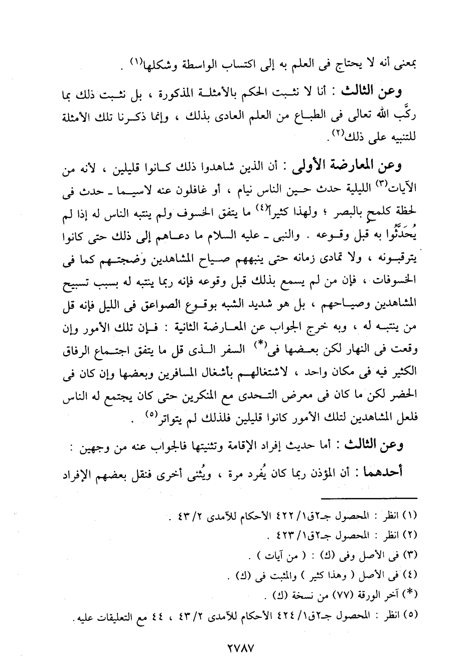 وعن المعارضة الأولى: أن الذين شاهدوا ذلك كانوا قليلين، لأنه من الآيات الليلية حدث حين الناس نيام، أو غافلون عنه لا سيما - حدث في لحظة كلمح بالبصر؛ ولهذا كثيرا ما يتفق الخسوف ولم ينتبه الناس له إذا لم يحدثوا به قبل وقوعه. والنبي - عليه السلام - ما دعاهم إلى ذلك حتى كانوا يترقبونه، ولا تمادى زمانه حتى ينبههم صياح المشاهدين وضجتهم كما في الخسوفات، فإن من لم يسمع بذلك قبل وقوعه فإنه ربما ينتبه له بسبب تسبيح المشاهدين وصياحهم، بل هو شديد الشبه بوقوع الصواعق في الليل فإنه قل من ينتبه له، وبه خرج الجواب عن المعارضة الثانية: فإن تلك الأمور وإن وقعت في النهار لكن بعضها في السفر الذي قل ما يتفق اجتماع الرفاق الكثير فيه في مكان واحد، لاشتغالهم بأشغال المسافرين وبعضها وإن كان في الحضر لكن ما كان في معرض التحدي مع المنكرين حتى كان يجتمع له الناس فلعل المشاهدين لتلك الأمور كانوا قليلين فلذلك لم يتواتر.