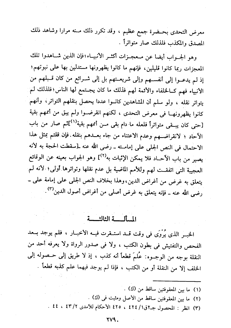 وهو الجواب أيضا عن معجزات أكثر الأنبياء؛ فإن الذي شاهدوا تلك المعجزات ربما كانوا قليلين، فإنهم ما كانوا يظهرونها مستدلين بها على نبوتهم؛ إذ لم يدعوا إلى أنفسهم وإلى شريعتهم بل إلى شرائع من كان قبلهم من الأنبياء فهم كالخلفاء والأئمة لهم فذلك ما كان يجتمع لها الناس؛ فلذلك لم يتواتر نقله، ولو سلم أن المشاهدين كانوا عددا يحصل بنقلهم التواتر، وأنهم كانوا يظهرونها في معرض التحدي، لكنهم انقرضوا ولم يبق من أممهم بقية [حتى كان يبقى متواترا فلعله ما دام بقي من أممهم بقية] ثم صار من باب الآحاد؛ لانقراضهم وعدم الاعتناء من جاء بعدهم بنقله. فإن قلتم بمثل هذا الاحتمال في النص الجلي على إمامته - رضي الله عنه -[سقطت الحجة به لأنه يصير من باب الآحاد فلا يمكن الإثبات به] وهو الجواب بعينه عن الوقائع العجيبة التي اتفقت لهم وللأمم الماضية بل عدم نقلها وتواترها أولى؛ لأنه لم يتعلق به غرض من أغراض الدين، وهذا بخلاف النص الجلي على إمامة علي - رضي الله عنه - فإنه يتعلق به غرض أصلي من أغراض أصول الدين.