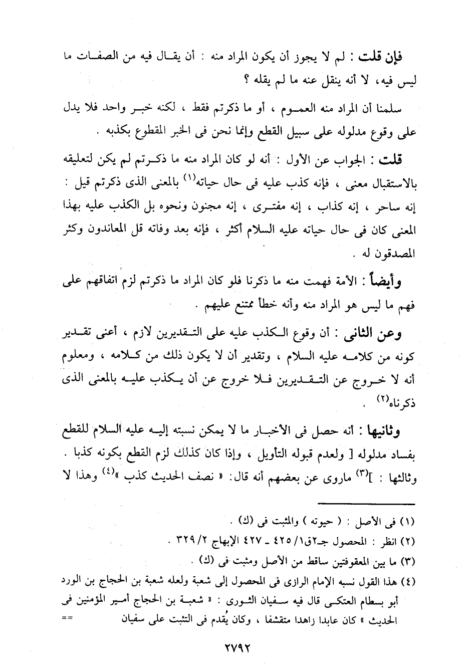 وعن الثاني: أن وقوع الكذب عليه على التقديرين لازم، أعني تقدير كونه من كلامه - عليه السلام -، وتقدير أن لا يكون ذلك من كلامه، ومعلوم أنه لا خروج عن التقديرين فلا خروج عن أن يكذب عليه بالمعنى الذي ذكرناه.