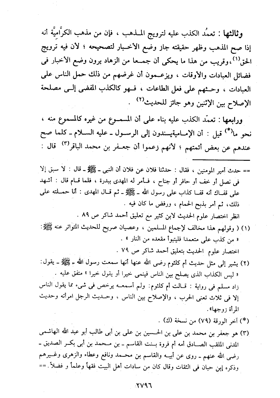 وثالثها: تعمد الكذب عليه لترويج المذهب، فإن من مذهب الكرامية أنه إذا صح المذهب وظهر حقيقته جاز وضع الأخبار لتصحيحه؛ لأن فيه ترويج الحق، وقريب من هذا ما يحكى أن جمعا من الزهاد يرون وضع الأخبار في فضائل العبادات والأوقات، ويزعمون أن غرضهم من ذلك حمل الناس على العبادات، وحثهم على فعل الطاعات، فهو كالكذب المفضي إلى مصلحة الإصلاح بين الإثنين وهو جائز للحديث.