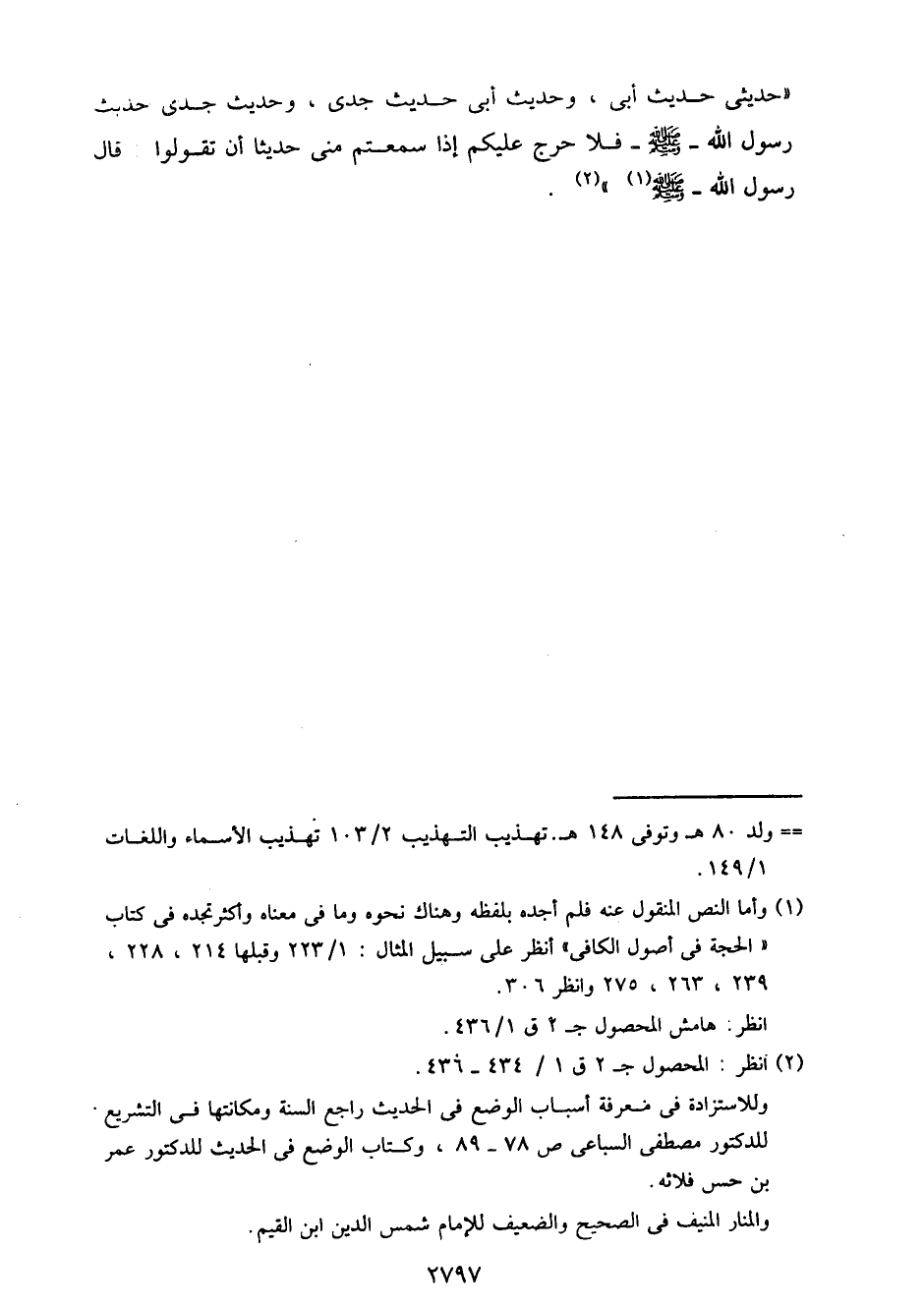 "حديثي حديث أبي، وحديث أبي حديث جدي، وحديث جدي حديث رسول الله - صلى الله عليه وسلم - فلا حرج عليكم إذا سمعتم مني حديثا أن تقولوا قال رسول الله - صلى الله عليه وسلم -".