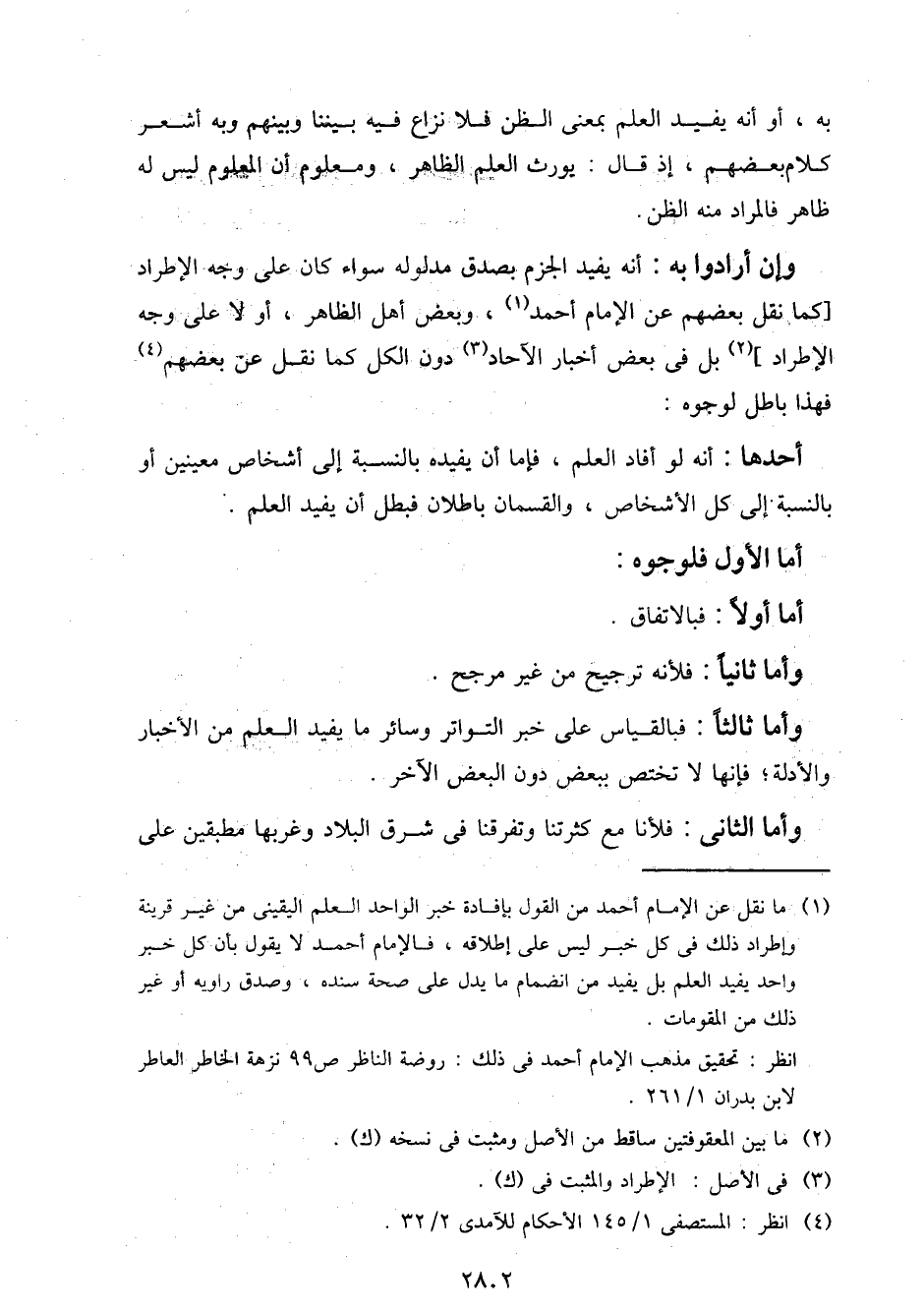 وإن أرادوا به: أنه يفيد الجزم بصدق مدلوله سواء كان على وجه الإطراد [كما نقل بعضهم عن الإمام أحمد، وبعض أهل الظاهر، أو لا على وجه الإطراد] بل في بعض أخبار الآحاد دون الكل كما نقل عن بعضهم فهذا باطل لوجوه: