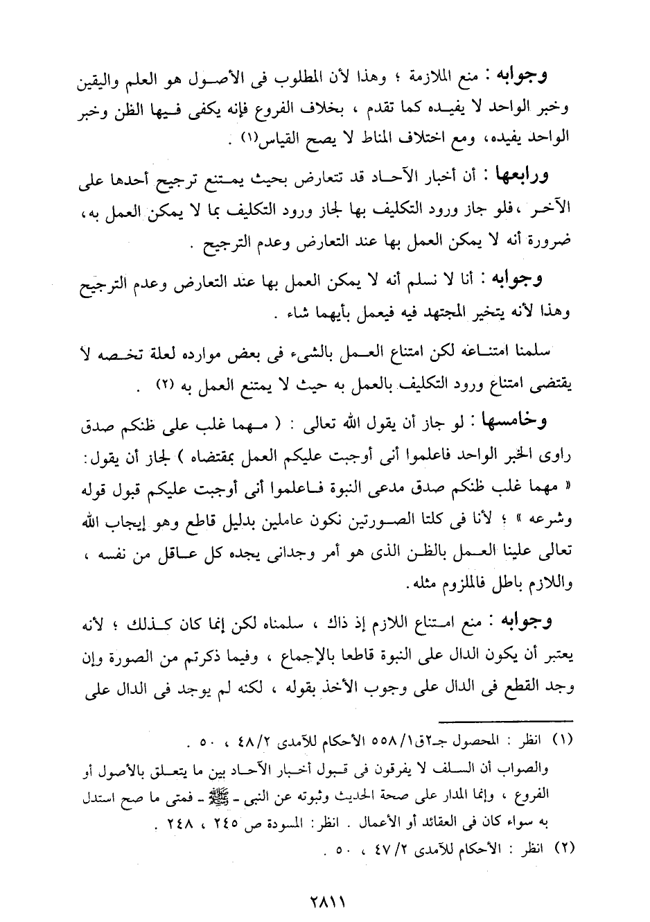 وخامسها: لو جاز أن يقول الله تعالى: (مهما غلب على ظنكم صدق راوي الخبر الواحد فاعلموا أني أوجبت عليكم العمل بمقتضاه) لجاز أن يقول: "مهما غلب ظنكم صدق مدعي النبوة فاعلموا أني أوجبت عليكم قبول قوله وشرعه"؛ لأنا في كلتا الصورتين نكون عاملين بدليل قاطع وهو إيجاب الله تعالى علينا العمل بالظن الذي هو أمر وجداني يجده كل عاقل من نفسه، واللازم باطل فالملزوم مثله.