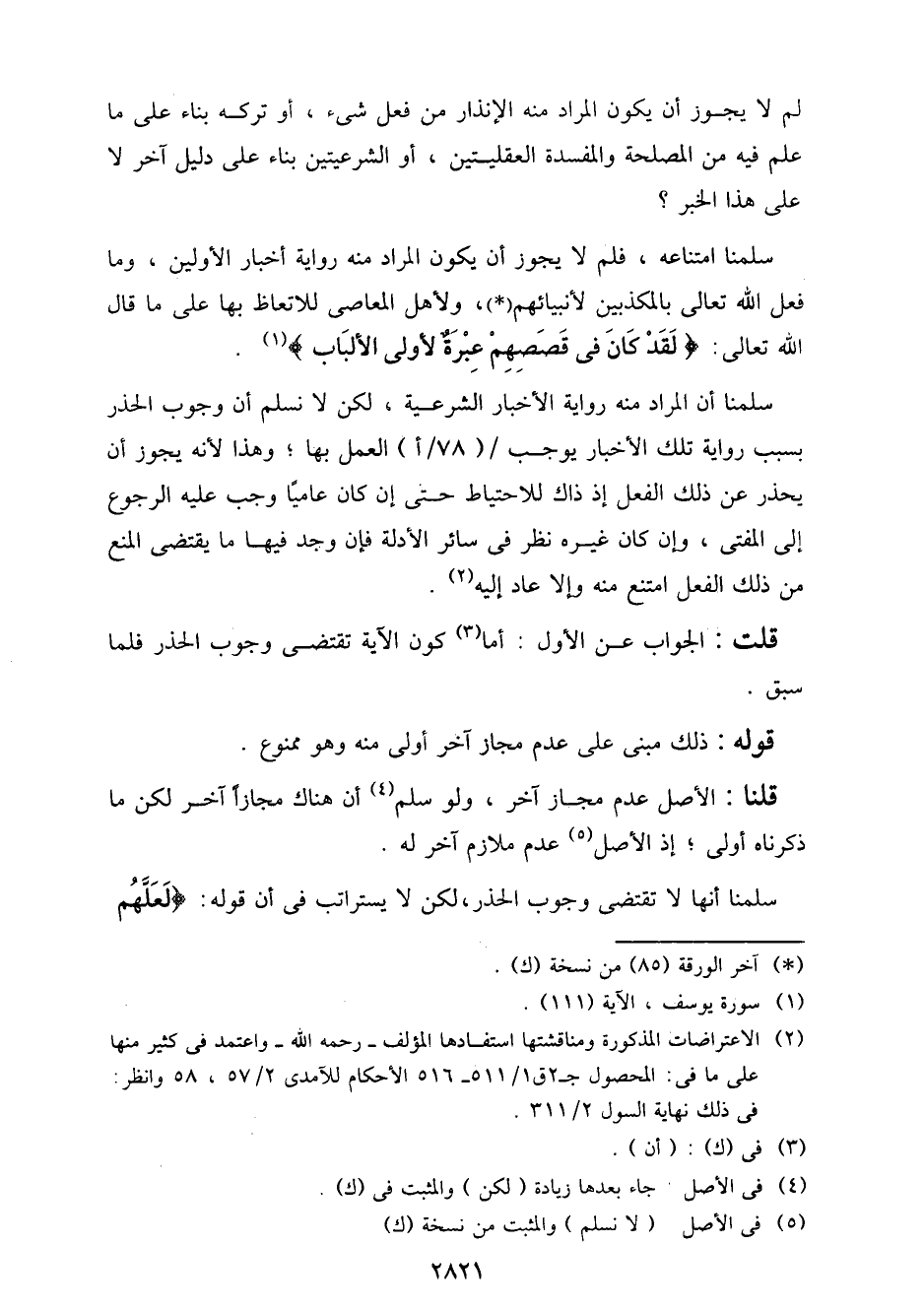 سلمنا أن المراد منه رواية الأخبار الشرعية، لكن لا نسلم أن وجوب الحذر بسبب رواية تلك الأخبار يوجب / (78/أ) العمل بها؛ وهذا لأنه لا يجوز أن يحذر عن ذلك الفعل إذ ذاك للاحتياط حتى إن كان عاميا وجب عليه الرجوع إلى المفتي، وإن كان غيره نظر في سائر الأدلة فإن وجد فيها ما يقتضي المنع من ذلك الفعل امتنع منه وإلا عاد إليه.