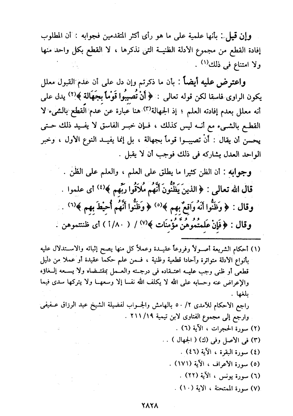 وإن قيل: بأنها علمية على ما هو رأي أكثر المتقدمين فجوابه: أن المطلوب إفادة القطع من مجموع الأدلة الظنية التي نذكرها، لا القطع بكل واحد منها ولا امتناع في ذلك.