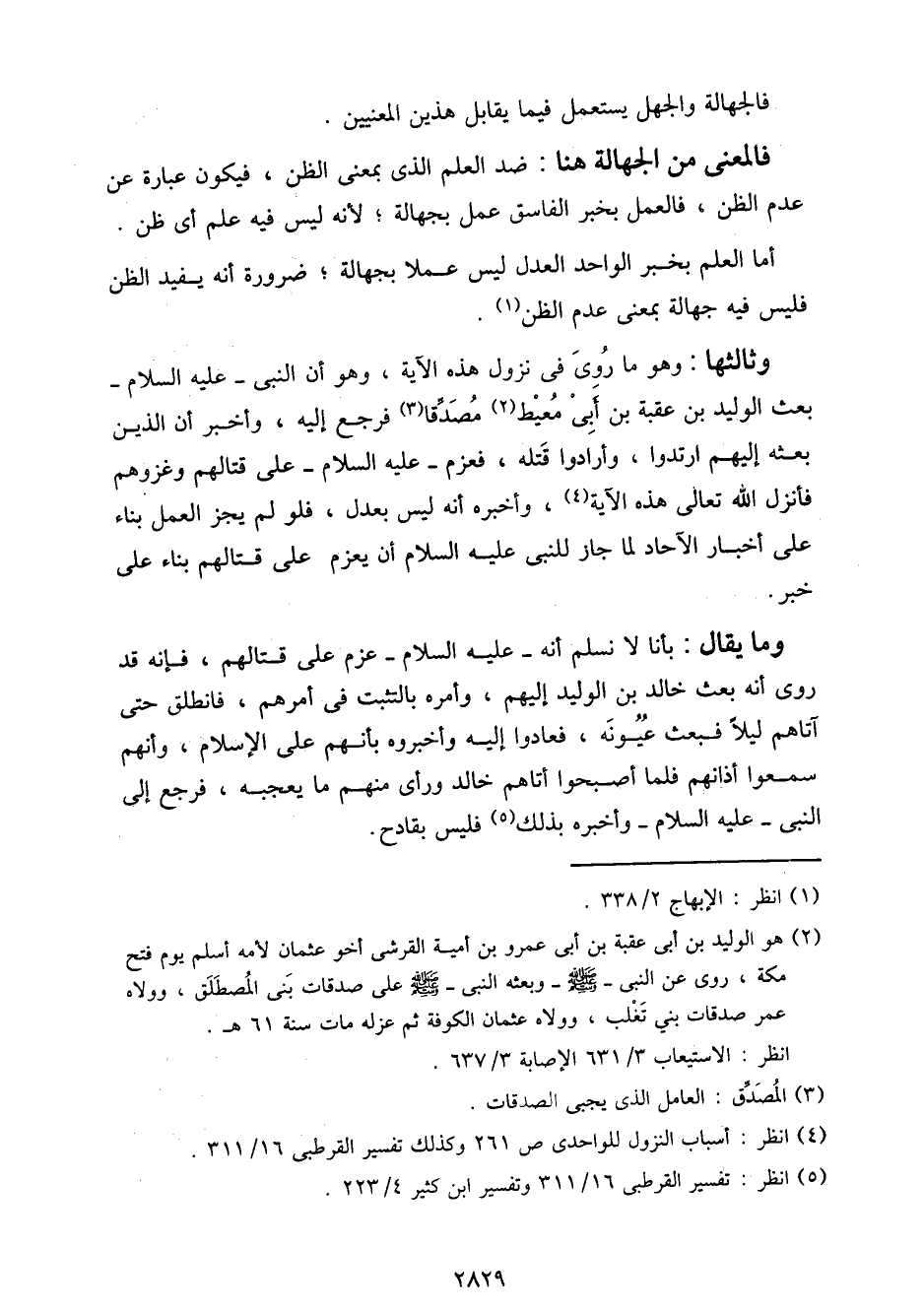 وثالثها: وهو ما روي في نزول هذه الآية، وهو أن النبي - عليه السلام - بعث الوليد بن عقبة بن أبي معيط مصدقا فرجع إليه، وأخبر أن الذين بعثه إليهم ارتدوا، وأرادوا قتله، فعزم - عليه السلام - على قتالهم وغزوهم فأنزل الله تعالى هذه الآية، وأخبره أنه ليس بعدل، فلو لم يجز العمل بناء على أخبار الآحاد لما جاز للنبي عليه السلام أن يعزم على قتالهم بناء على خبر.