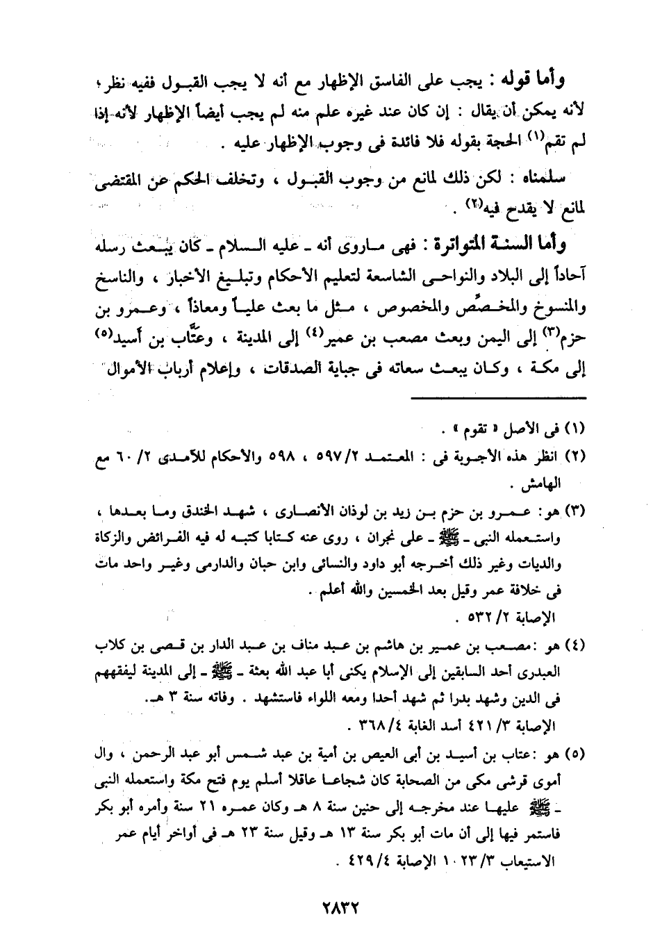وأما السنة المتواترة: فهي ما روي أنه - عليه السلام - كان يبعث رسله آحادا إلى البلاد والنواحي الشاسعة لتعليم الأحكام وتبليغ الأخبار، والناسخ والمنسوخ والمخصص والمخصوص، مثل ما بعث عليا ومعاذا، وعمر بن حزم إلى اليمن وبعث مصعب بن عمير إلى المدينة، وعتاب بن أسيد إلى مكة، وكان يبعث سعاته في جباية الصدقات، وإعلام أرباب الأموال