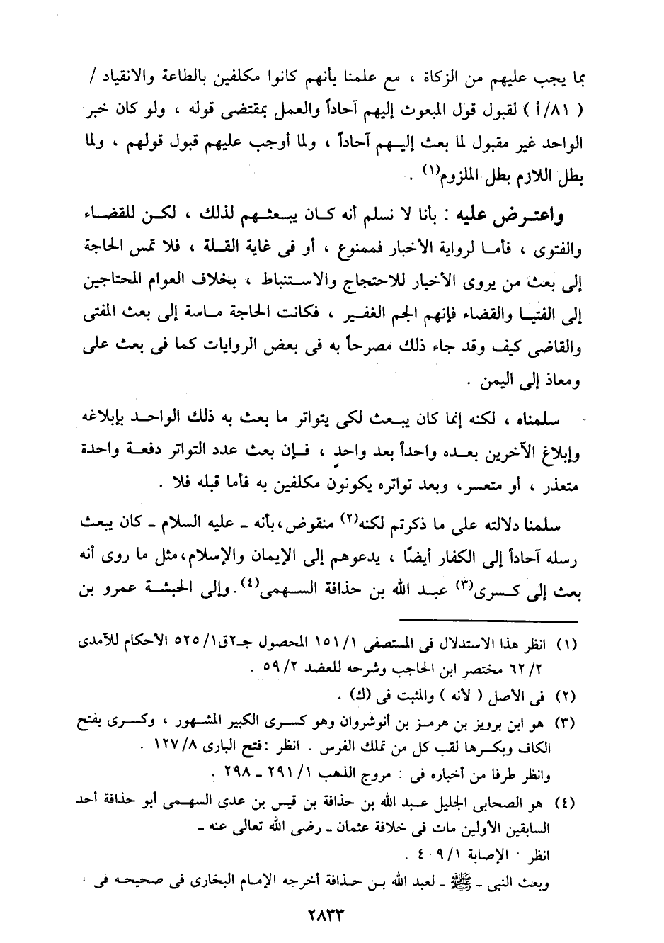 سلمنا دلالته على ما ذكرتم لكنه منقوض، بأنه - عليه السلام - كان يبعث رسله آحادا إلى الكفار أيضا، يدعوهم إلى الإيمان والإسلام، مثل ما روي أنه بعث إلى كسرى عبد الله بن حذاقة السهمي. والى الحبشة عمرو بن