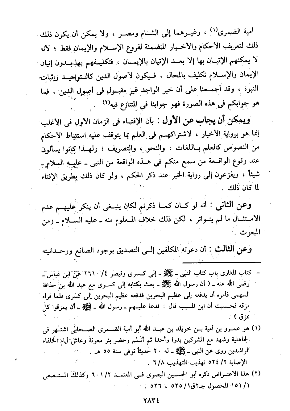 أمية الضمري، وغيرهما إلى الشام ومصر، ولا يمكن أن يكون ذلك ذلك لتعريف الأحكام والأخبار المتضمنة لفروع الإسلام والإيمان فقط؛ لأنه لا يمكنهم الإتيان بها إلا بعد الإتيان بالإيمان، فتكليفهم بها دون إتيان الإيمان والإسلام تكليف بالمحال، فيكون لأصول الدين كالتوحيد وإثبات النبوة، وقد أجمعنا على أن خبر الواحد غير مقبول في أصول الدين، فما هو جوابكم في هذه الصورة فهو جوابنا في المتنازع فيه.