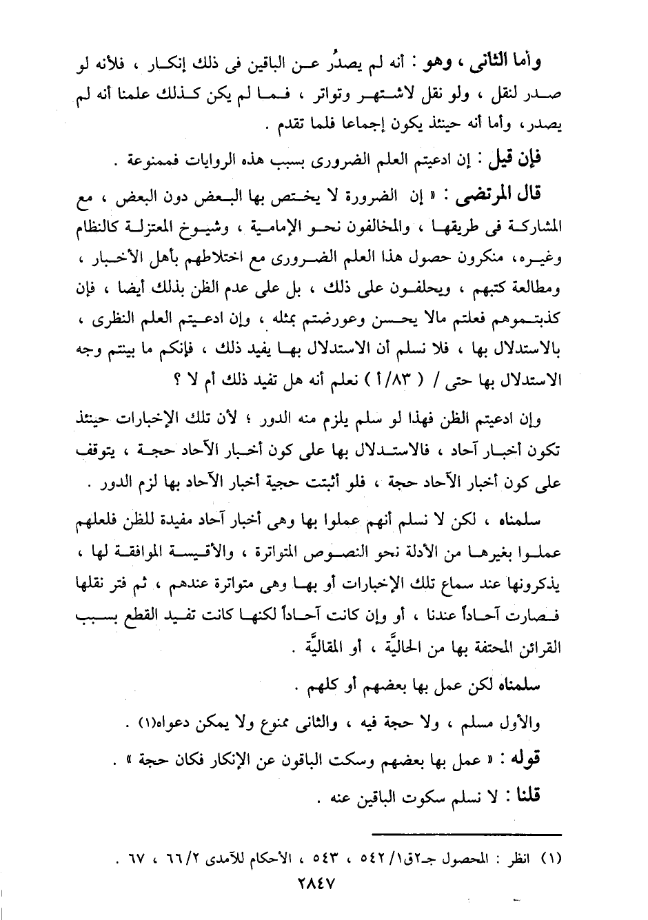 قال المرتضى: "إن الضرورة لا يختص بها البعض دون البعض، مع المشاركة في طريقها، والمخالفون نحو الإمامية، وشيوخ المعتزلة كالنظام وغيره، منكرون حصول هذا العلم الضروري مع اختلاطهم بأهل الأخبار، ومطالعة كتبهم، ويحلفون على ذلك، بل على عدم الظن بذلك أيضا، فإن كذبتموهم فعلتم ما لا يحسن وعورضتم بمثله، وإن ادعيتم العلم النظري، بالاستدلال بها، فلا نسلم أن الاستدلال بها يفيد ذلك، فإنكم ما بينتم وجه الاستدلال بها حتى / (83/أ) نعلم أنه هل تفيد ذلك أم لا؟