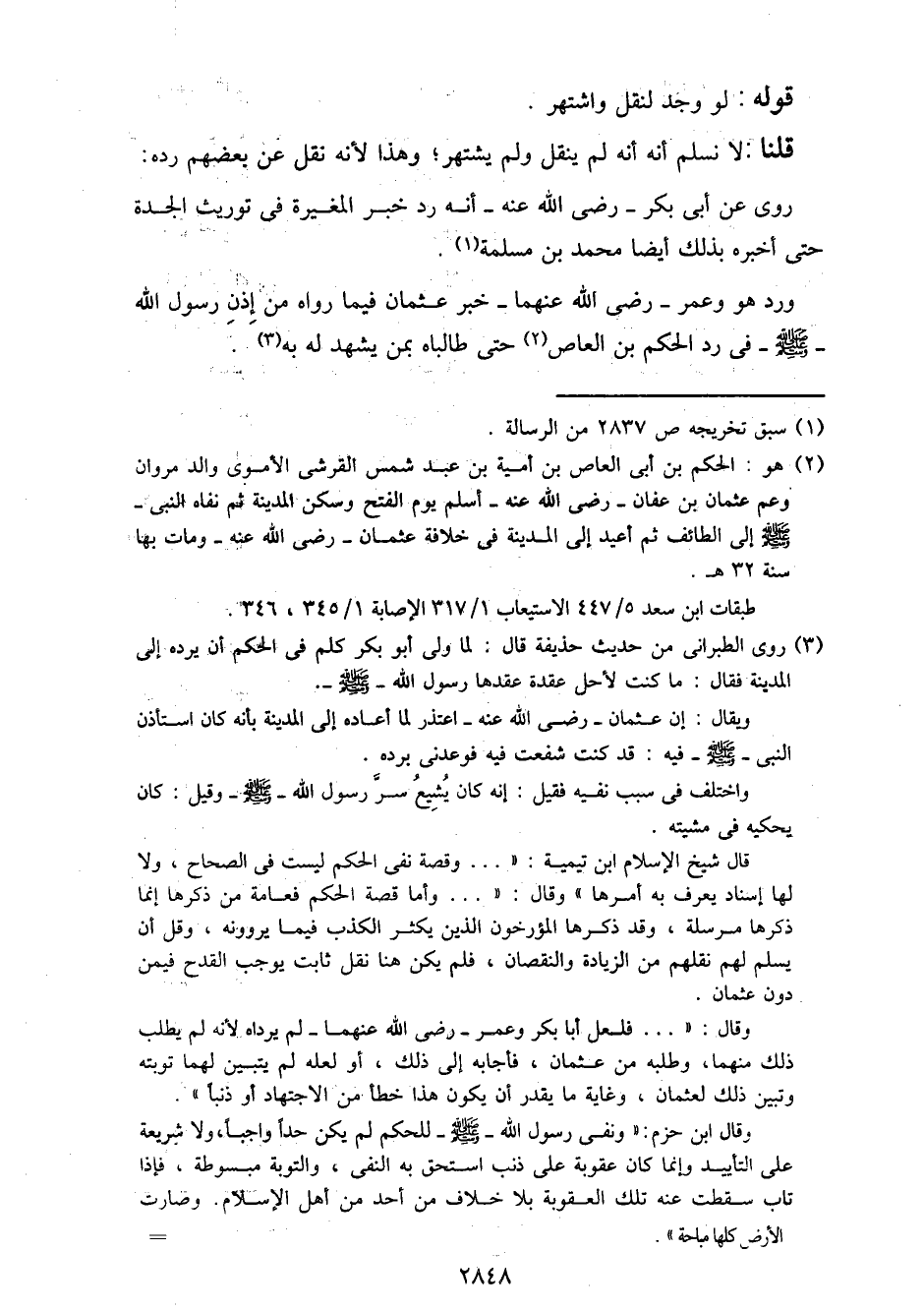 ورد هو وعمر - رضي الله عنهما - خبر عثمان فيما رواه من إذن رسول الله - صلى الله عليه وسلم - في رد الحكم بن العاص حتى طالباه بمن يشهد له به.