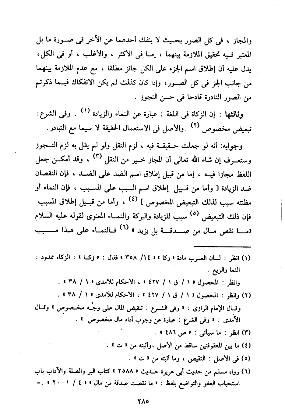 وجوابه: أنه لو جعلت حقيقة فيه، لزم النقل ولو لم يقل به لزم التجوز وستعرف إن شاء الله تعالى أن المجاز خير من النقل، وقد أمكن جعل اللفظ مجازا فيه، إما من قبيل إطلاق اسم الضد على الضد، فإن النقصان ضد الزيادة [وأما من قبيل إطلاق اسم السبب على المسبب، فإن النماء أو مظنته سبب لذلك التبعيض المخصوص]، وأما من قبيل إطلاق المسبب فإن ذلك التبعيض سبب للزيادة والبركة والنماء المعنوي لقوله عليه السلام "ما نقص مال من صدقة بل يزيد" فالنماء على هذا مسبب
