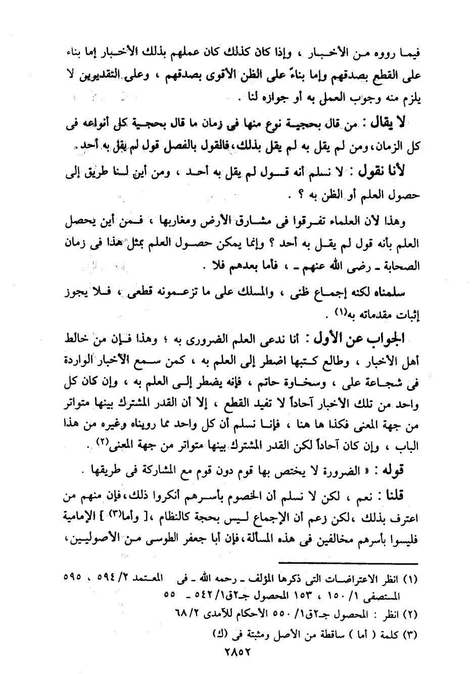 قلنا: نعم، لكن لا نسلم أن الخصوم بأسرهم أنكروا ذلك، فإن منهم من اعترف بذلك، لكن زعم أن الإجماع ليس بحجة كالنظام، [وأما] الإمامية فليسوا بأسرهم مخالفين في هذه المسألة، فإن أبا جعفر الطوسي من الأصوليين،
