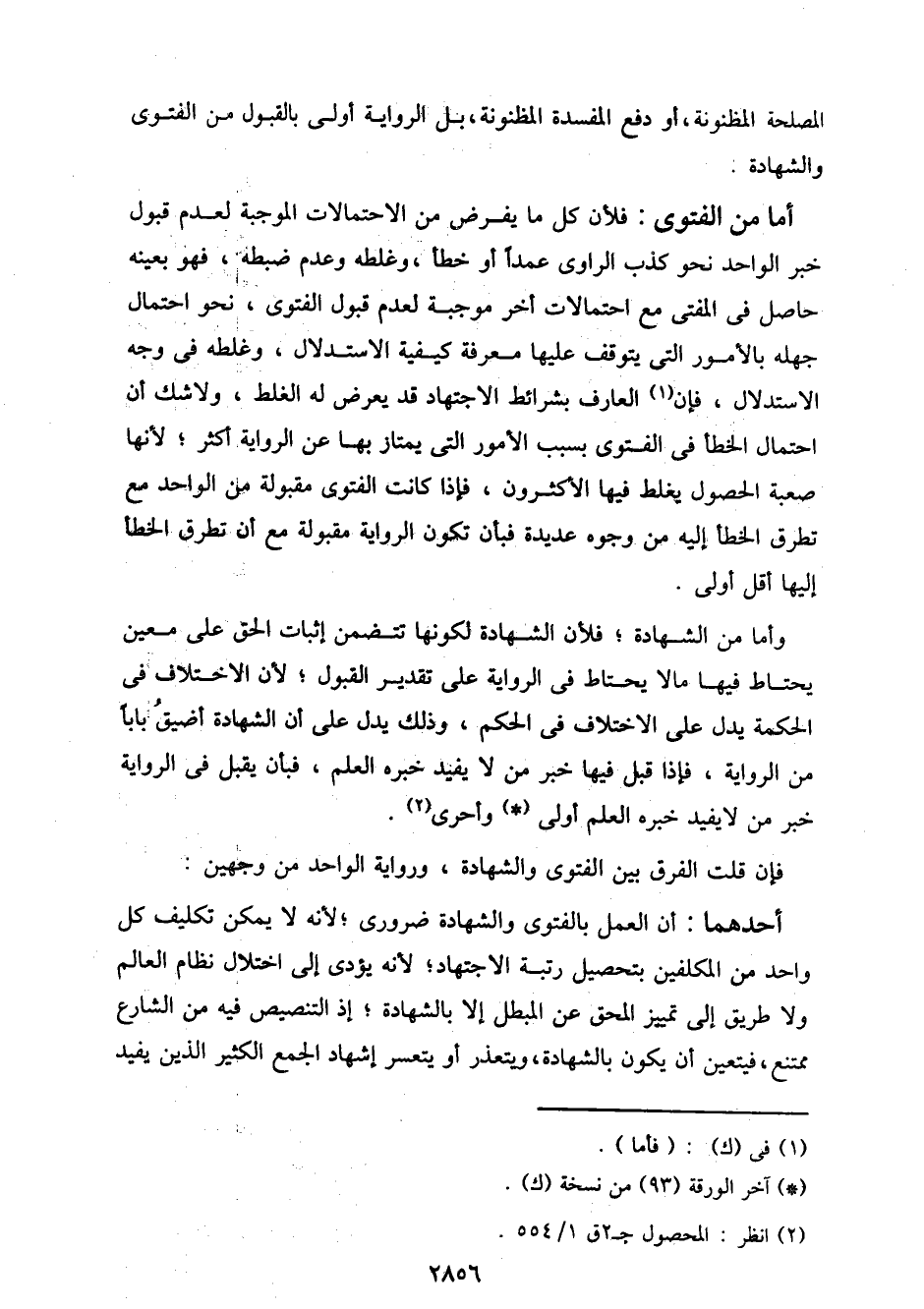 أما من الفتوى: فلأن كل ما يفرض من الاحتمالات الموجبة لعدم قبول خبر الواحد نحو كذب الراوي عمدا أو خطأ، وغلطه وعدم ضبطه، فهو بعينه حاصل في المفتى مع احتمالات أخر موجبة لعدم قبول الفتوى، نحو احتمال جهله بالأمور التي يتوقف عليها معرفة كيفية الاستدلال، وغلطه في وجه الاستدلال، فإن العارف بشرائط الاجتهاد قد يعرض له الغلط، ولا شك أن احتمال الخطأ في الفتوى بسبب الأمور التي يمتاز بها عن الرواية أكثر؛ لأنها صعبة الحصول يغلط فيها الأكثرون، فإذا كانت الفتوى مقبولة من الواحد مع تطرق الخطأ إليه من وجوه عديدة فبأن تكون الرواية مقبولة مع أن تطرق الخطأ إليها أقل أولى.