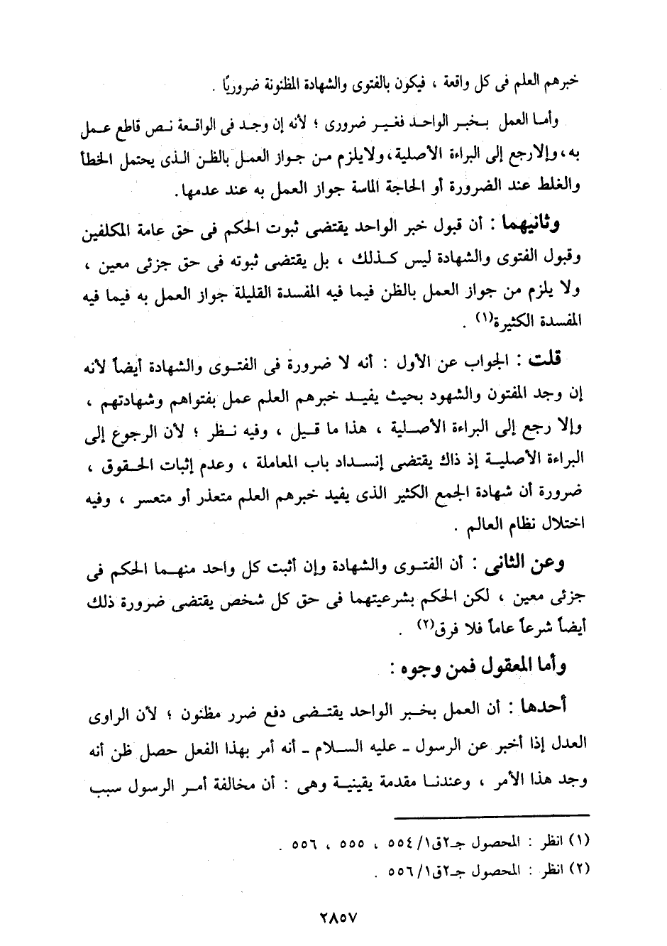 وأما العمل بخبر الواحد فغير ضروري؛ لأنه إن وجد في الواقعة نص قاطع عمل به، وإلا رجع إلى البراءة الأصلية، ولا يلزم من جواز العمل بالظن الذي يحتمل الخطأ والغلط عند الضرورة أو الحاجة الماسة جواز العمل به عند عدمها.
