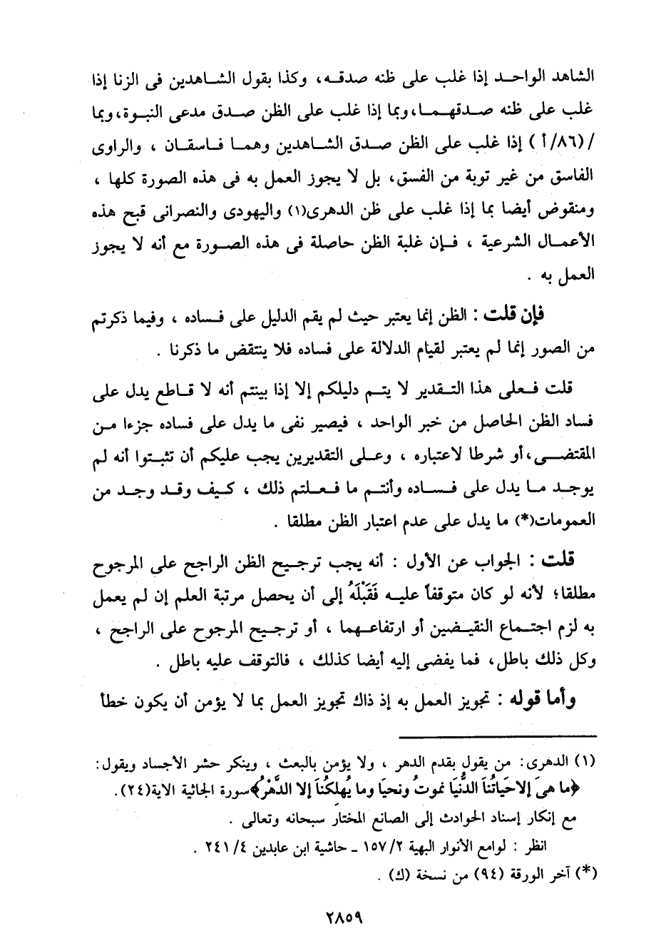 قلت فعلى هذا التقدير لا يتم دليلكم إلا إذا بينتم أنه لا قاطع يدل على فساد الظن الحاصل من خبر الواحد، فيصير نفي ما يدل على فساده جزءا من المقتضى، أو شرطا لاعتباره، وعلى التقديرين يجب عليكم أن تثبتوا أنه لم يوجد ما يدل على فساده وأنتم ما فعلتم ذلك، كيف وقد وجد من العمومات ما يدل على عدم اعتبار الظن مطلقا.