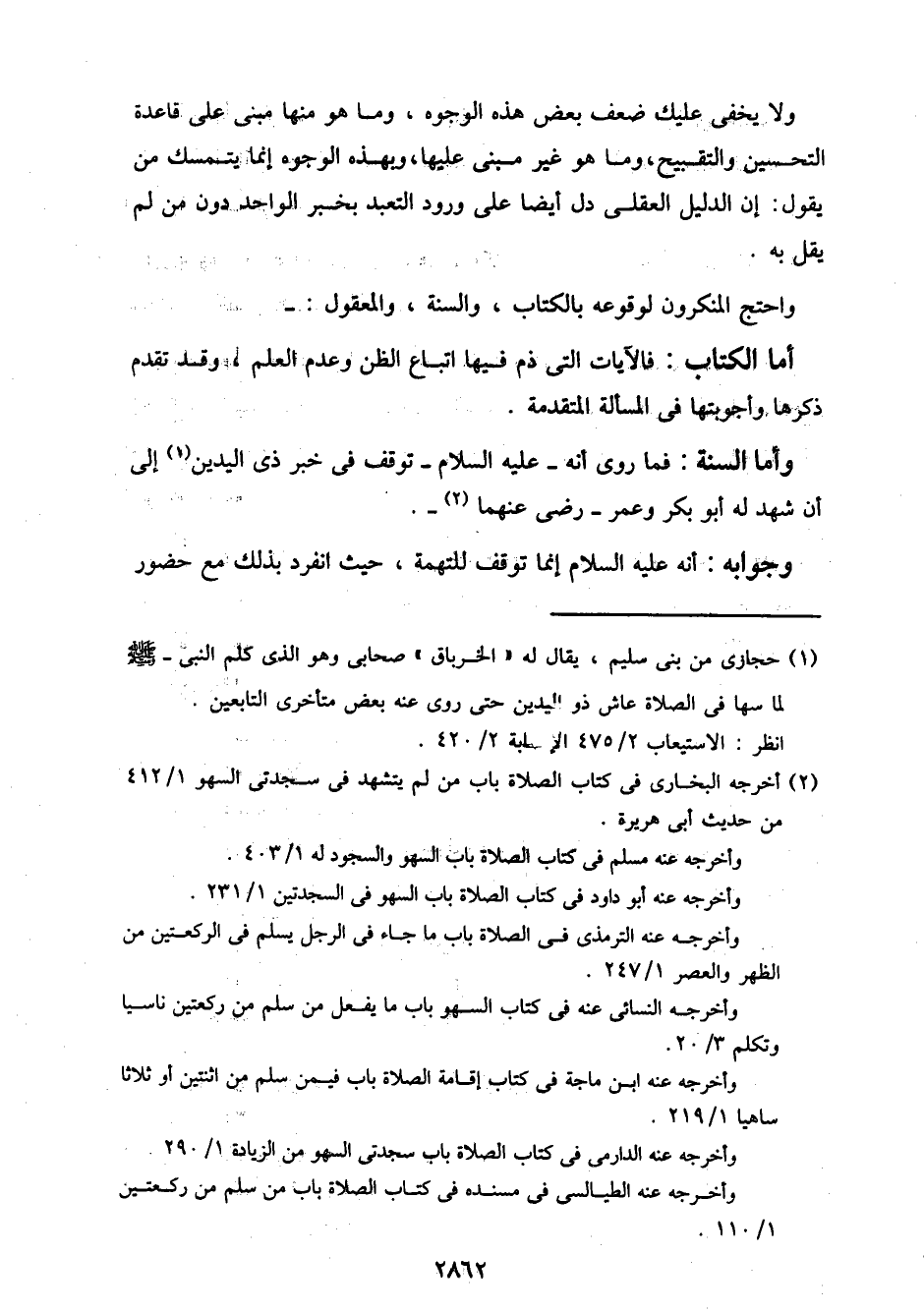 وأما السنة: فما روي أنه - عليه السلام - توقف في خبر ذي اليدين إلى أن شهد له أبو بكر وعمر - رضي الله عنهما -.