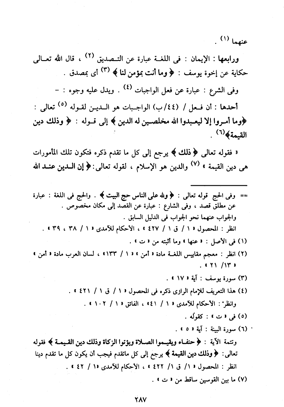 أحدها: أن فعل/ (44/ب) الواجبات هو الدين لقوله تعالى: {وما أمروا إلا ليعبدوا الله مخلصين له الدين} إلى قوله: {وذلك دين القيمة}.