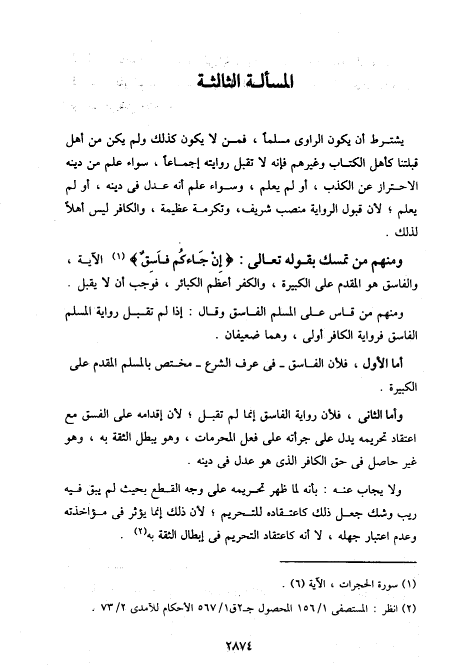 وأما الثاني، فلأن رواية الفاسق إنما لم تقبل؛ لأن إقدامه على الفسق مع اعتقاد تحريمه يدل على جرأته على فعل المحرمات، وهو يبطل الثقة به، وهو غير حاصل في حق الكافر الذي هو عدل في دينه.
