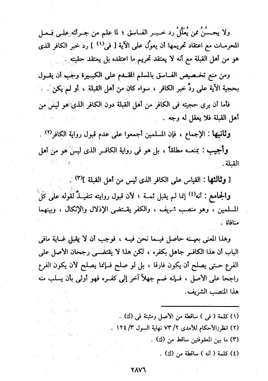 ولا يحسن ممن يعلل رد خبر الفاسق؛ لما علم من جرأته على فعل المحرمات مع اعتقاد تحريمها أن يعول على الآية [في] رد خبر الكافر الذي هو من أهل القبلة مع أنه لا يعتقد تحريم ما اعتقده بل يعتقد حقيقته.