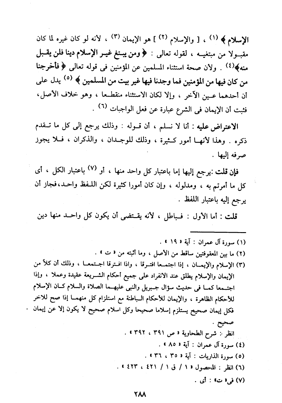الإسلام}، [والإسلام] هو الإيمان، لأنه لو كان غيره لما كان مقبولا من مبتغيه، لقوله تعالى: {ومن يبتغ غير الإسلام دينا فلن يقبل منه}. ولأن صحة استثناء المسلمين عن المؤمنين في قوله تعالى {فأخرجنا من كان فيها من المؤمنين فما وجدنا فيها غير بيت من المسلمين} يدل على أن أحدهما عين الآخر، وإلا لكان الاستثناء منقطعا، وهو خلاف الأصل، فثبت أن الإيمان في الشرع عبارة عن فعل الواجبات.