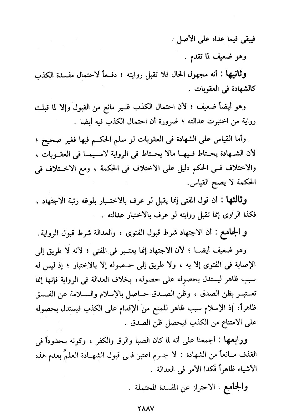 وهو ضعيف أيضا؛ لأن الاجتهاد إنما يعتبر في المفتي؛ لأنه لا طريق إلى الإصابة في الفتوى إلا به، ولا طريق إلى حصوله إلا بالاختبار؛ إذ ليس له سبب ظاهر ليستدل بحصوله على حصوله، بخلاف العدالة في الرواية فإنها إنا تعتبر بظن الصدق، وظن الصدق حاصل بالإسلام والسلامة عن الفسق ظاهرا، إذ الإسلام سبب ظاهر للمنع من الإقدام على الكذب فيستدل بحصوله على الامتناع من الكذب فيحصل ظن الصدق.