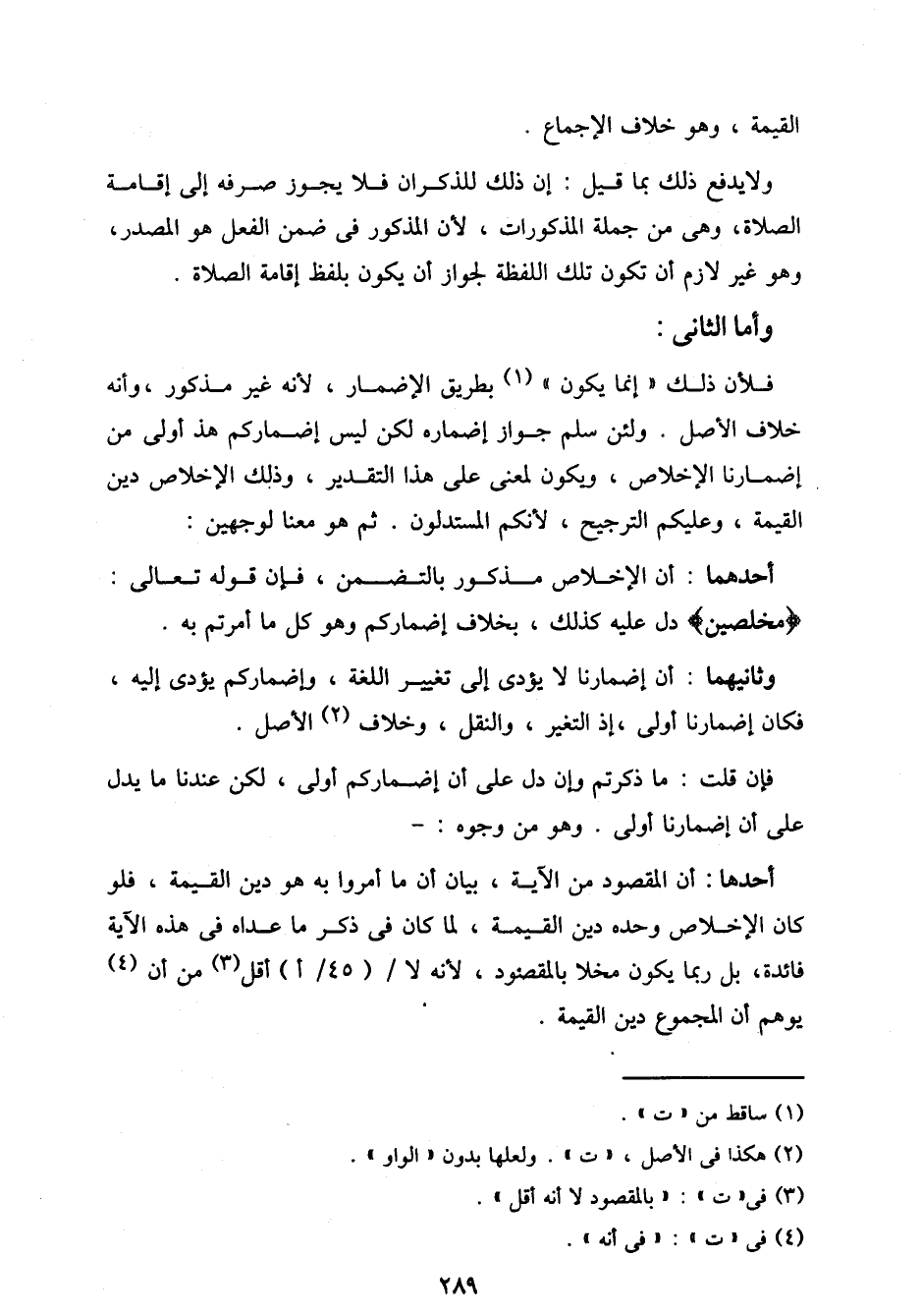 فلأن ذلك "إنما يكون" بطريق الإضمار، لأنه غير مذكور، وأنه خلاف الأصل. ولئن سلم جواز إضماره لكن ليس إضماركم هذا أولى من إضمارنا الإخلاص، ويكون لمعنى على هذا التقدير، وذلك الإخلاص دين القيمة، وعليكم الترجيح، لأنكم المستدلون. ثم هو معنا لوجهين:
