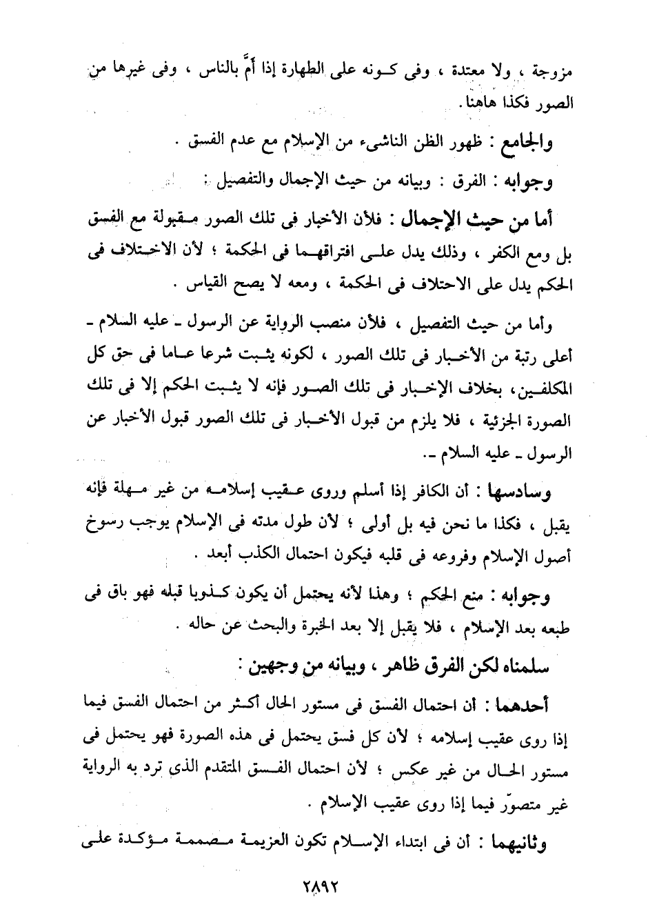 أحدهما: أن احتمال الفسق في مستور الحال أكثر من احتمال الفسق فيما إذا روى عقيب إسلامه؛ لأن كل فسق يحتمل في هذه الصورة فهو يحتمل في مستور الحال من غير عكس؛ لأن احتمال الفسق المتقدم الذي ترد به الرواية غير متصور فيما إذا روى عقيب الإسلام.