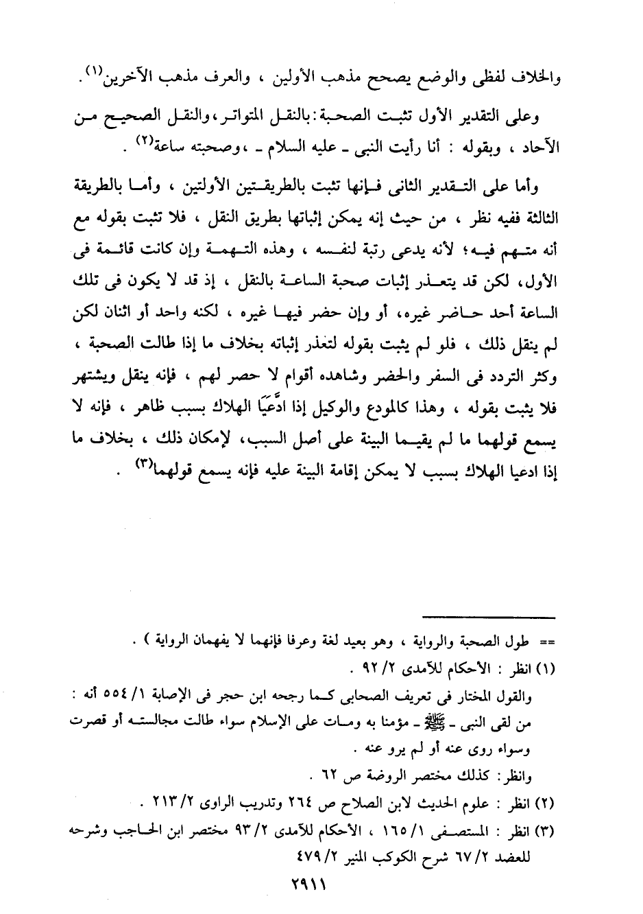 وعلى التقدير الأول تثبت الصحبة: بالنقل المتواتر، والنقل الصحيح من الآحاد، وبقوله: أنا رأيت النبي - عليه السلام -، وصحبته ساعة.