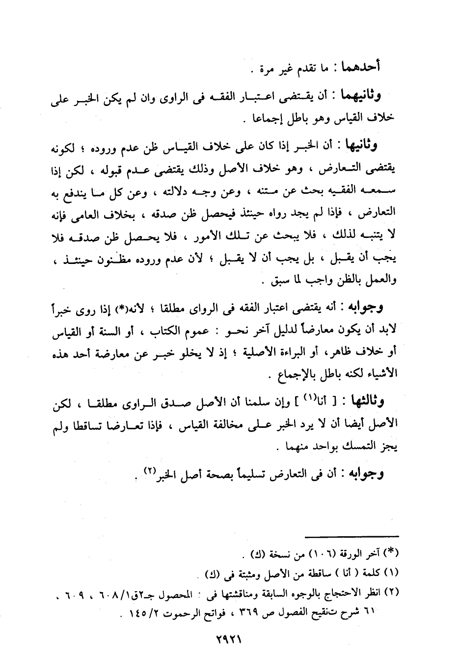 وجوابه: أنه يقتضي اعتبار الفقه في الرواي مطلقا؛ لأنه إذا روى خبرا لا بد أن يكون معارضا لدليل آخر نحو: عموم الكتاب، أو السنة أو القياس أو خلاف ظاهر، أو البراءة الأصلية؛ إذ لا يخلو خبر عن معارضة أحد هذه الأشياء لكنه باطل بالإجماع.