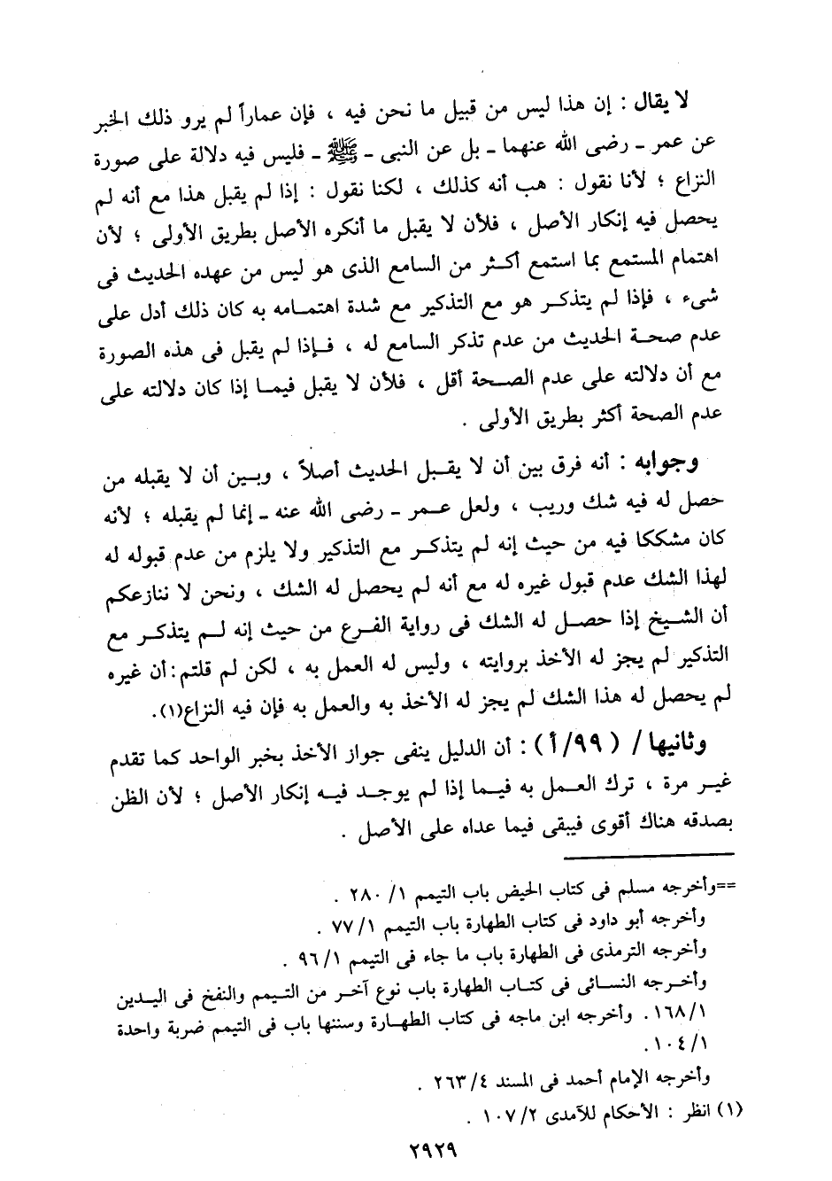 لا يقال: إن هذا ليس من قبيل ما نحن فيه، فإن عمارا لم يرو ذلك الخبر عن عمر - رضي الله عنهما - بل عن النبي - صلى الله عليه وسلم - فليس فيه دلالة على صورة النزاع؛ لأنا نقول: هب أنه كذلك، لكنا نقول: إذا لم يقبل هذا مع أنه لم يحصل فيه إنكار الأصل، فلأن لا يقبل ما أنكره الأصل بطريق الأولى؛ لأن اهتمام المستمع بما استمع أكثر من السامع الذي هو ليس من عهده الحديث في شيء، فإذا لم يتذكر هو مع التذكير مع شدة اهتمامه به كان ذلك أدل على عدم صحة الحديث من عدم تذكر السامع له، فإذا لم يقبل في هذه الصورة مع أن دلالته على عدم الصحة أقل، فلأن لا يقبل فيما إذا أن دلالته على عدم الصحة أكثر بطريق الأولى.