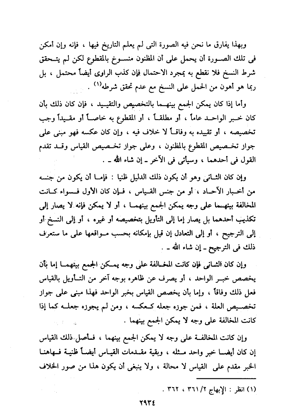 وأما إذا كان يمكن الجمع بينهما بالتخصيص والتقييد، فإن كان ذلك بأن كان خبر الواحد عاما، أو مطلقا، أو المقطوع به خاصا أو مقيدا وجب تخصيصه، أو تقييده به وفاقا لا خلاف فيه، وإن كان عكسه فهو مبني على جواز تخصيص المقطوع بالمظنون، وعلى جواز تخصيص القياس وقد تقدم القول في أحدهما، وسيأتي في الآخر - إن شاء الله -.
