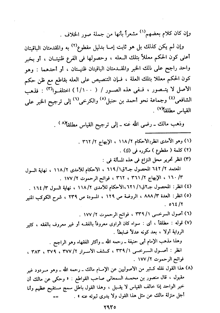 وإن لم يكن كذلك بل هو ثابت إما بدليل مقطوع به والمقدمتان الباقيتان أعني كون الحكم معللا بتلك العله، وحصولها في الفرع ظنيتان، أو بخبر واحد راجح على ذلك الخبر والمقدمتان الباقيتان ظنيتان، أو أحدهما: وهو كون الحكم معللا بتلك العلة، فإن التنصيص على العله بقاطع مع ظن حكم الأصل لا يتصور، ففي هذه الصور / (100/أ) اختلفوا: فذهب الشافعي وجماعة نحو أحمد بن حنبل والكرخي إلى ترجيح الخبر على القياس مطلقا.