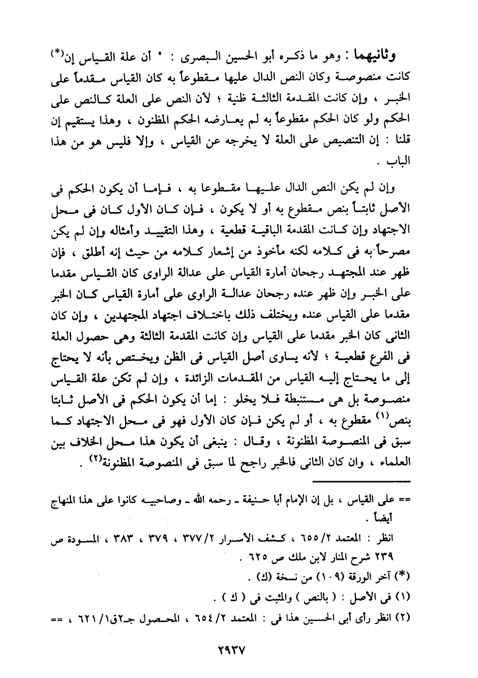وثانيهما: وهو ما ذكره أبو الحسين البصري: "أن علة القياس إن كانت منصوصة وكان النص الدال عليها مقطوعا به كان القياس مقدما على الخير، وإن كانت المقدمة الثالثة ظنية؛ لأن النص على العلة كالنص على الحكم ولو كان الحكم مقطوعا به لم يعارضه الحكم المظنون، وهذا يستقيم إن قلنا: إن التنصيص على العلة لا يخرجه عن القياس، وإلا فليس هو من هذا الباب.