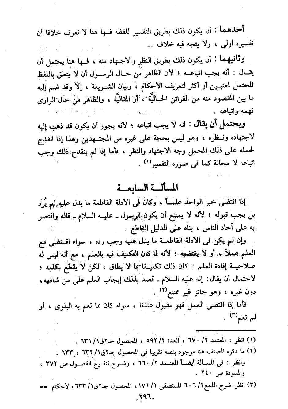 وثانيهما: أن يكون ذلك بطريق النظر والاجتهاد منه، فها هنا يحتمل أن يقال: أنه يجب اتباعه؛ لأن الظاهر من حال الرسول أن لا ينطق باللفظ المحتمل لمعنيين أو أكثر لتعريف الأحكام، وبيان الشريعة، إلا وقد ضم إليه ما بين المقصود منه من القرائن الحالية، أو المقالية، والظاهر من حال الراوي فهمه وابتاعه.