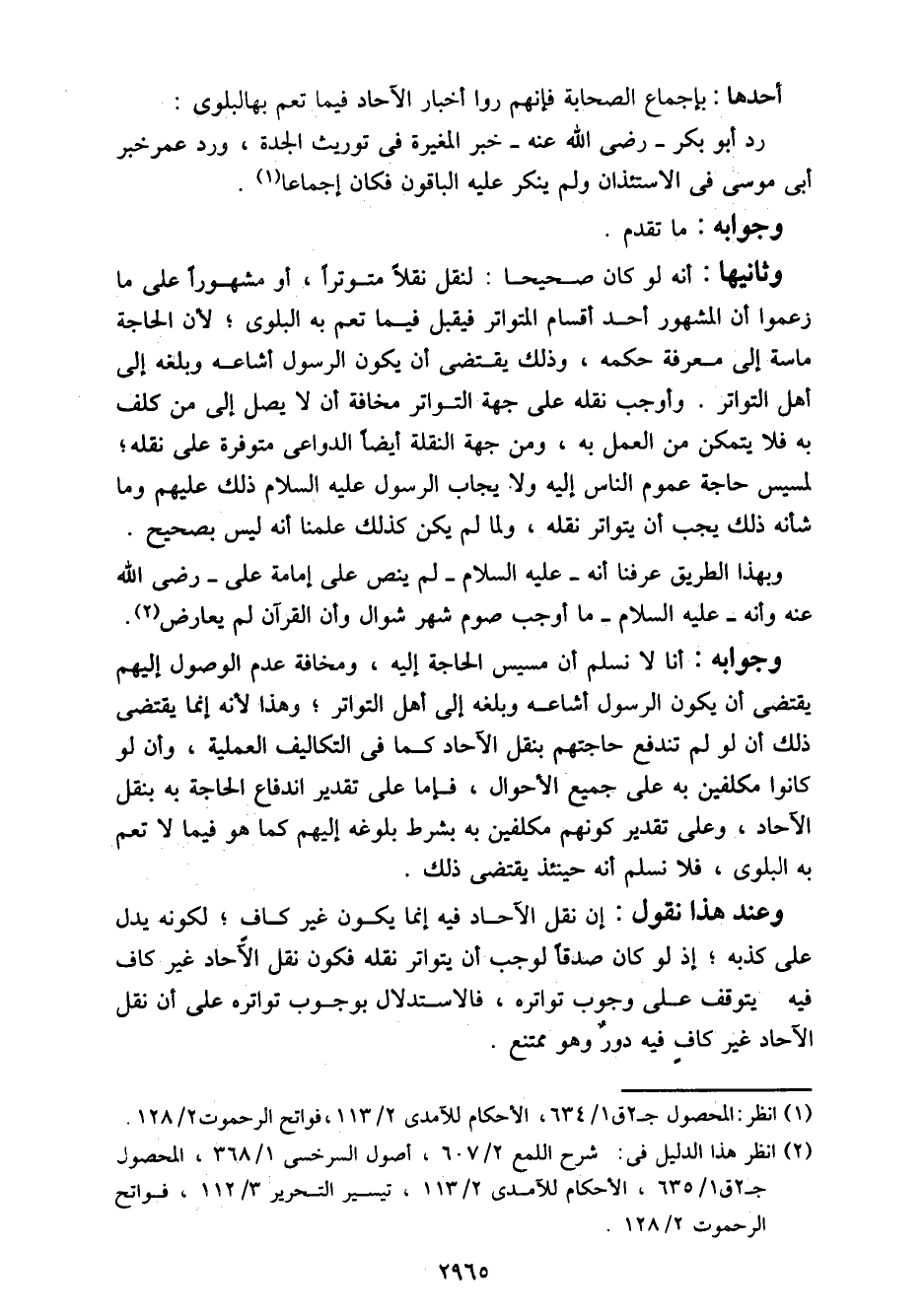وعند هذا نقول: إن نقل الآحاد فيه إنما يكون غير كاف؛ لكونه يدل على كذبه؛ إذ لو كان صدقا لوجب أن يتواتر نقله فيكون نقل الآحاد غير كاف فيه يتوقف على وجوب تواتره، فالاستدلال بوجوب تواتره على أن نقل الآحاد غير كاف فيه دور وهو ممتنع.