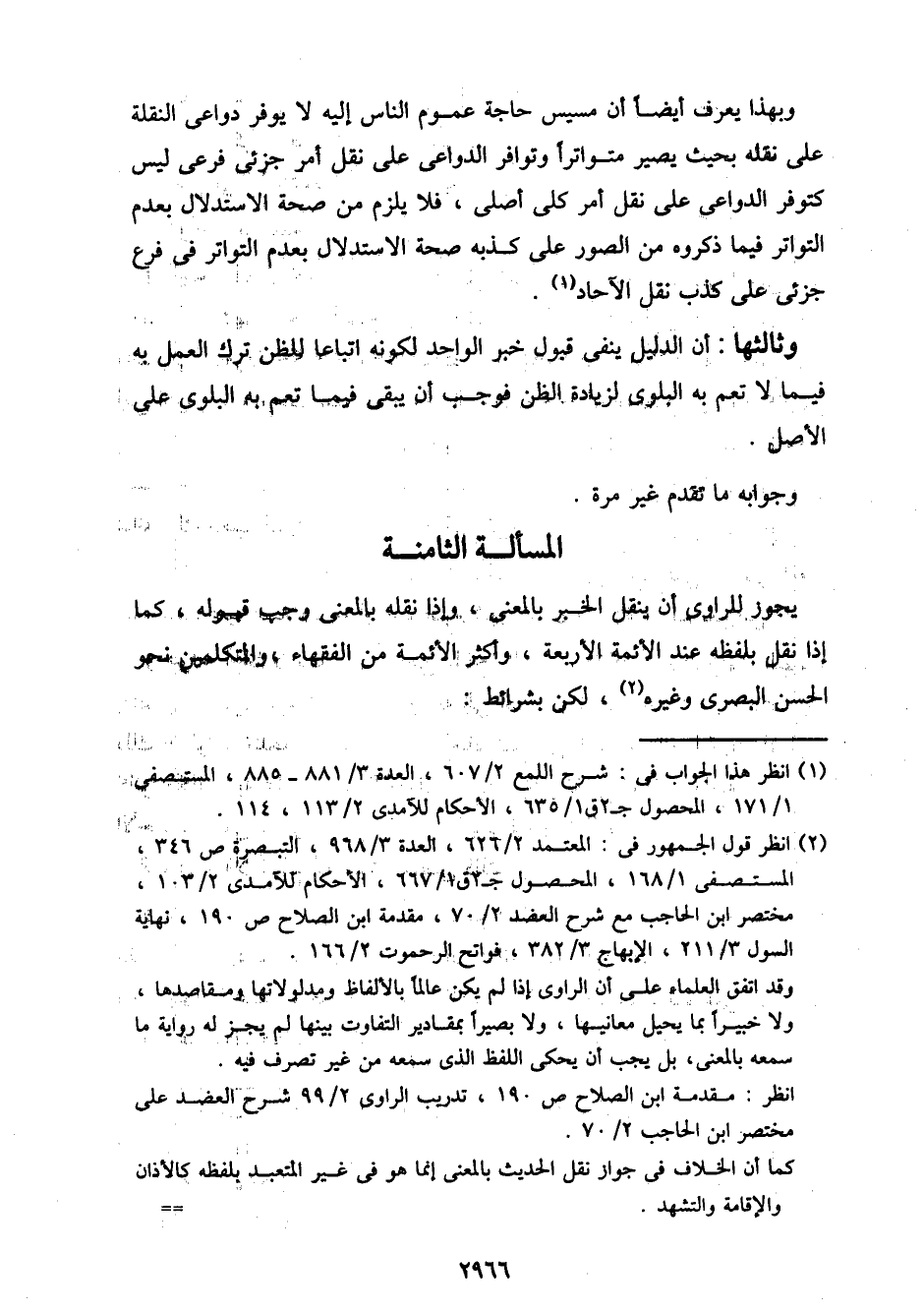 يجوز للراوي أن ينقل الخبر بالمعنى، وإذا نقله بالمعنى وجب قبوله، كما إذا نقل بلفظه عند الأئمة الأربعة، وأكثر الأئمة من الفقهاء، والمتكلمين نحو الحسن البصري وغيره، لكن بشرائط: