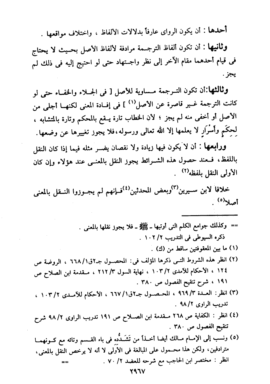 ورابعها: أن لا يكون فيها زيادة ولا نقصان يضر مثله فيما إذا كان النقل باللفظ، فعند حصول هذه الشرائط يجوز النقل بالمعنى عند هؤلاء وإن كان الأولى النقل بلفظه.