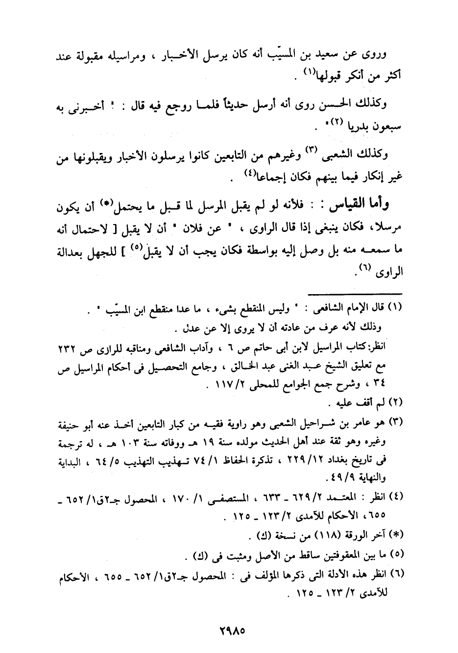 وأما القياس: فلأنه لو لم يقبل المرسل لما قبل ما يحتمل أن يكون مرسلا، فكان ينبغي إذا قال الراوي، "عن فلان" أن لا يقبل [لاحتمال أنه ما سمعه منه بل وصل إليه بواسطة فكان يجب أن لا يقبل] للجهل بعدالة الراوي.