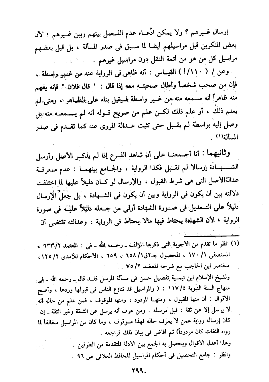 وثانيهما: أنا أجمعنا على أن شاهد الفرع إذا لم يذكر الأصل وأرسل الشهادة إرسالا لم تقبل فكذا الرواية، والجامع بينهما: عدم معرفة عدالة الأصل التي هي شرط القبول، والإرسال لو كان دليلا عليها لما اختلفت دلالته بين أن يكون في الرواية وبين أن يكون في الشهادة، بل جعل الإرسال دليلا على التعديل في صورة الشهادة أولى من جعله دليلا عليه في صورة الرواية؛ لأن الشهادة يحتاط فيها ما لا يحتاط في الرواية، وعدالته تقتضي أن